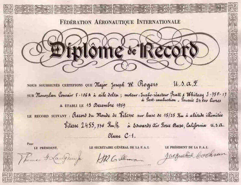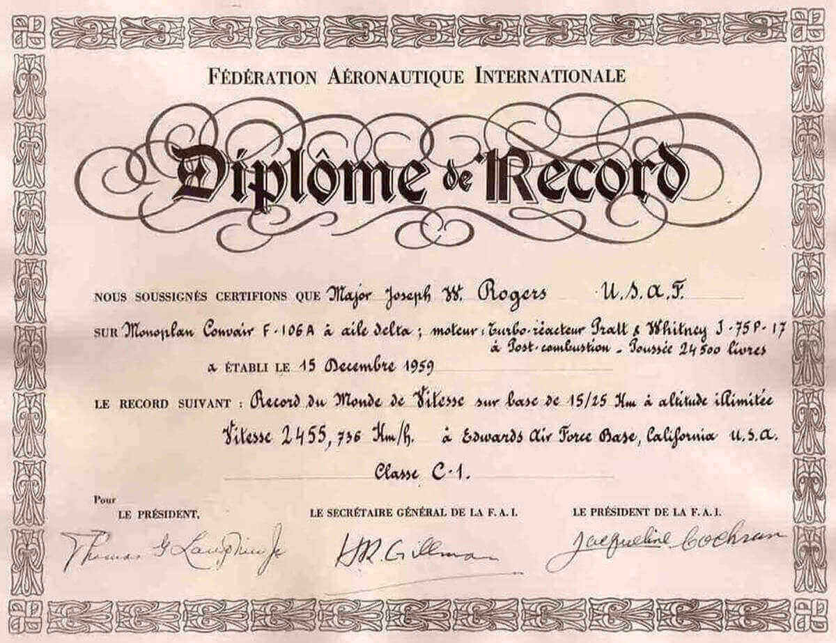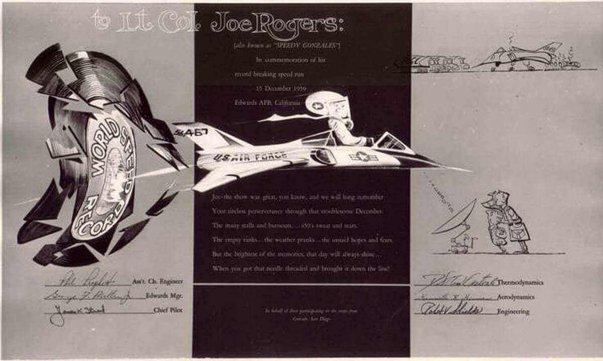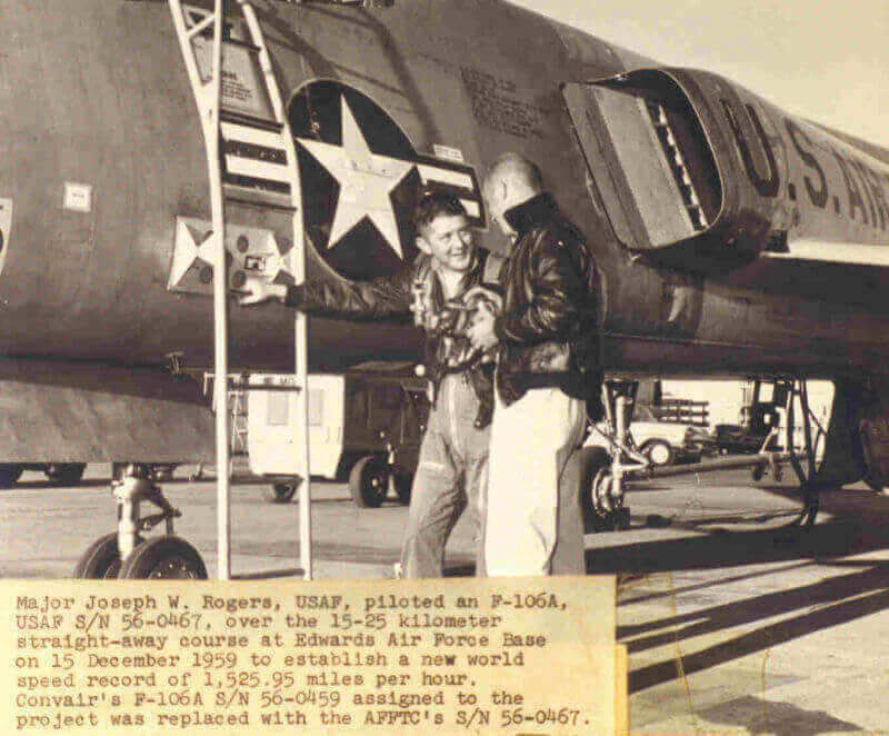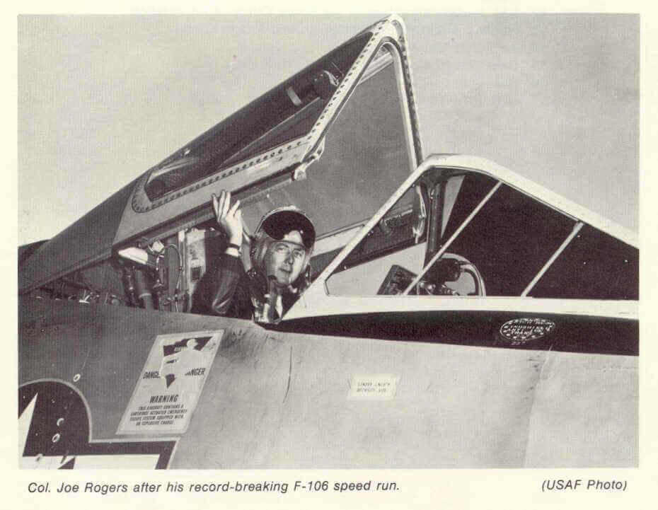 After the war, Col. Rogers flew the famed F-86 Sabre jet and in the mid- 1950s enrolled in the Air Force test pilot school. By the end of the decade, when the Air Force decided to go after what was called the "absolute speed record, there was no question who would pilot the aircraft in this joint USAF/Convair (the aircraft builder) project, Maj. Joe Rogers,"