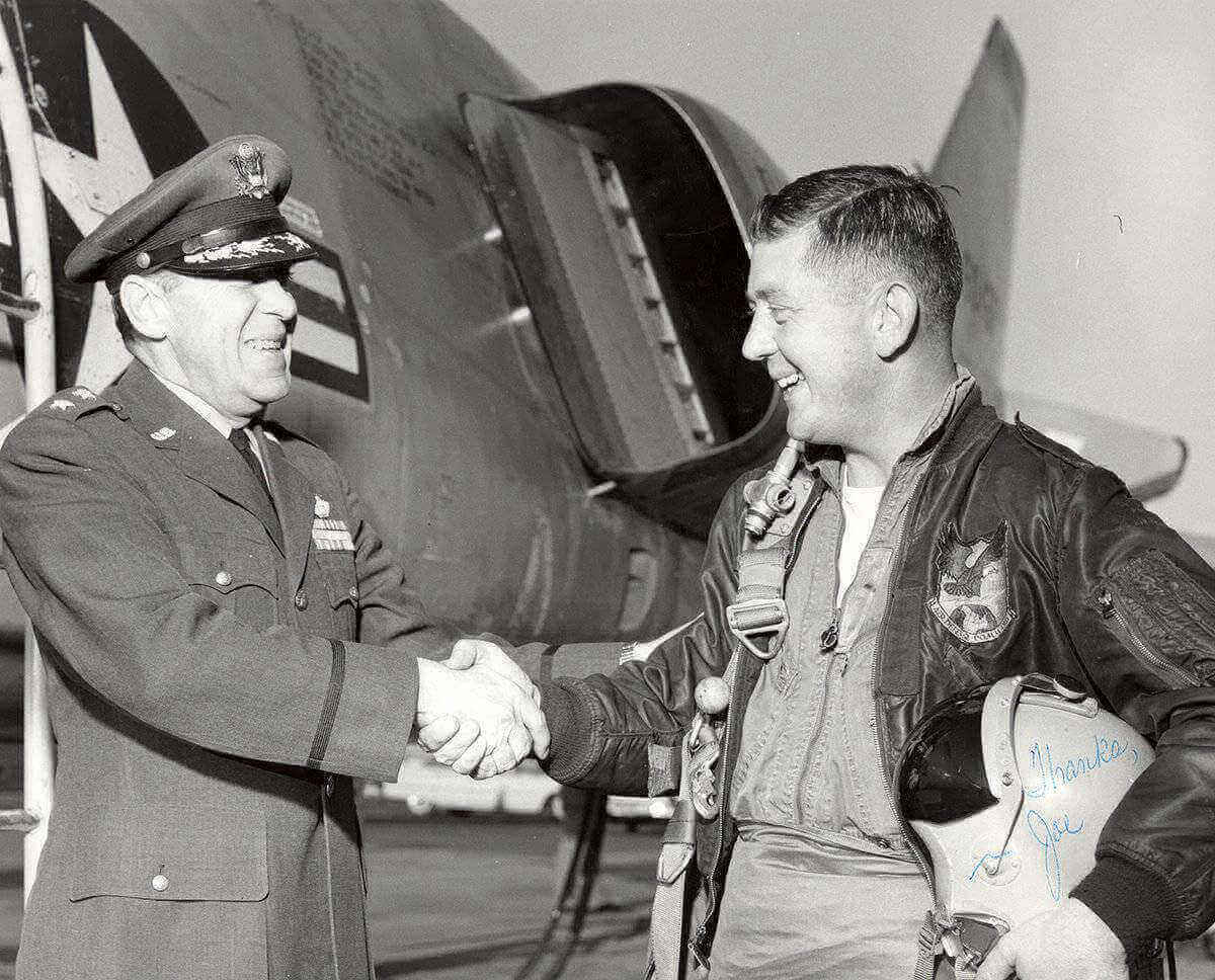 On November 8, 1950, the then Capt. Rogers achieved a rare MiG-15 jet kill while flying in his piston-engine F-51D Mustang named Buckeye Blitz VI. "This was unusual because of the speed differences between the two planes, " said Jim Cook, master crew chief at the Pacific Coast Air Museum in Santa Rosa and an old friend of Col. Rogers. "He was doing around 350 mph, and the jet was doing 450. There were four MiGs, and they were so much faster. They came over the top of Joe, and he took a lucky shot at them."